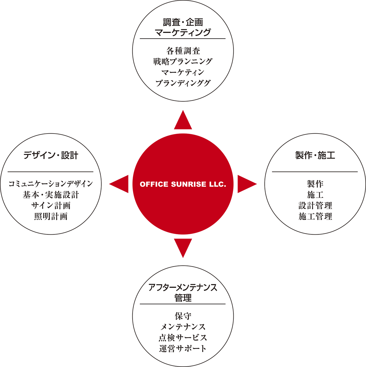 基本構想から携わり、お客様の事業コンセプトを理解した上で「調査・企画・マーケティング」「デザイン・設計」「制作・施工」「アフターメンテナンス・管理」の領域をお客様が抱えるさまざまな企業課題に応えるソリューションをご提供し、あらゆる面で一貫してサポートしていきます。